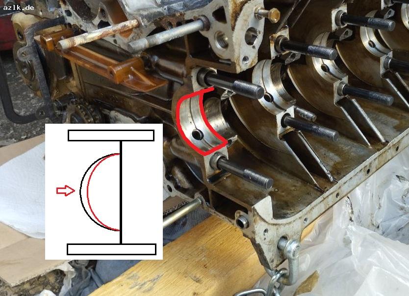 Zur einfacheren Erklärung hab ich hier mal ein Bild der Lagergasse meines Motors, als ich noch bei der Sanierung war und dazu meine vereinfachte Darstellung der Draufsicht. Schwarz ist die Halbschalen-Form wie sie sein sollte, rot wie sie bei mir dann war. Zwar nicht so extrem wie in der Skizze, sonst würde man es auf dem Bild sehen, da das noch vor dem Einschleifen war, aber die 0,05-0,1mm (ich weiß es leider nicht mehr exakt) haben ausgereicht, um die Kurbelwelle gänzlich zu blockieren.