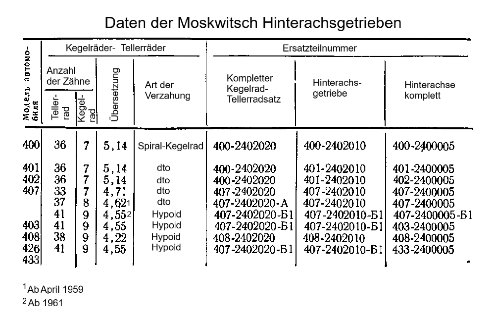 Für den Anfang ein paar Daten über die Moskwitsch Hinterachsgetrieben: