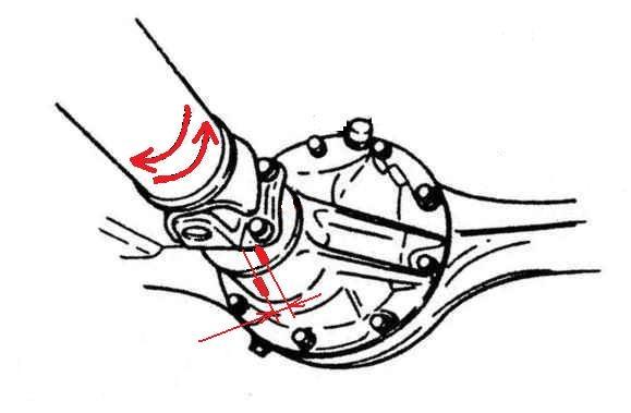 Um den Einfluss des Ausgleichsgetriebes und der Verzahung der Achswellen auf die Messung auszuschließen, kann man das Tellerrad wärend der Messung mit einem Dorn durch die Ölablassöffnung blockieren. Dabei müsste es eine deutliche Differenz zu den vorher angegebenen Messwerten ergeben. Das lässt aber auch nur grob auf den allgemeinen Zustand der gesamte Antriebsachse schließen, wei das Flankenspiel beim Kegelrad- Tellerradsatz kann nur beim ausgebauten Achsgetriebe gemessen werden.