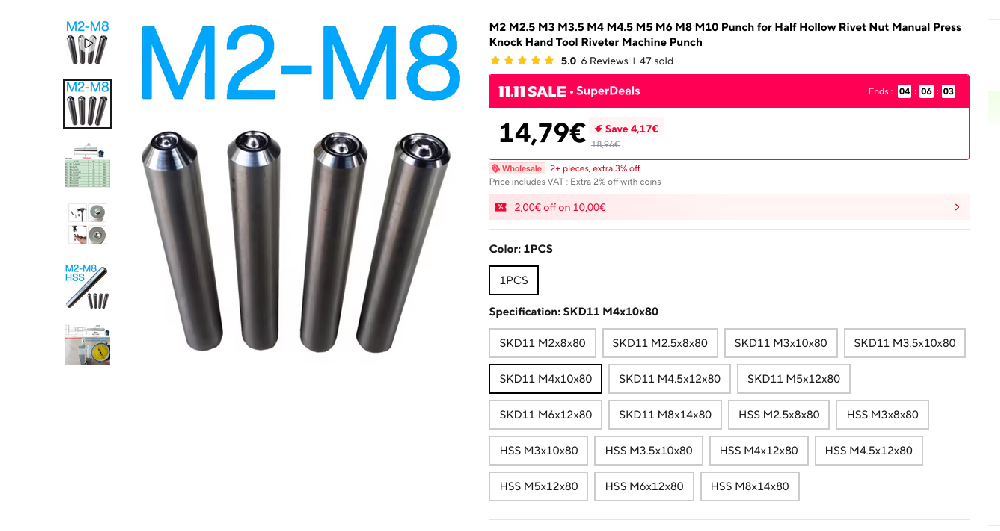 Einen Nietensetzer findet man auch nach langem Suchen z.B. bei AliExpress (in dem gezeigten Angebot bekommt man nur einen, den man richtig auswählen muss, für 4 mm Nieten ist es "M4")
