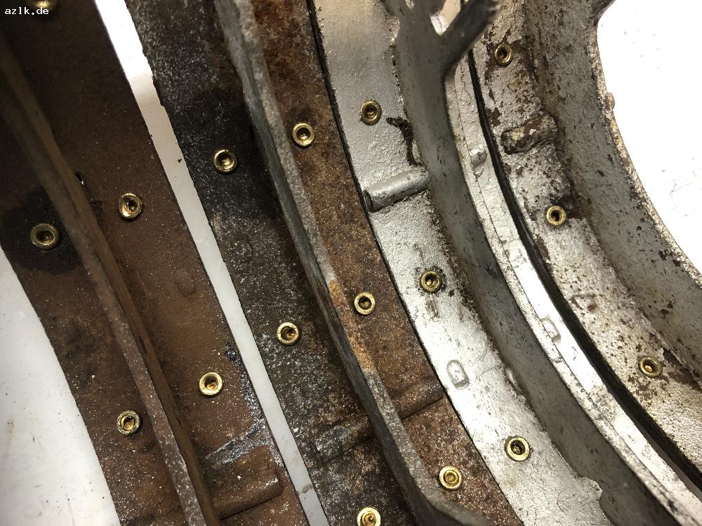 Eigentlich hätte mir das Nieten gereicht. Aber vorn gibt es ja die Bremsbacken mit den Gewichten. Diese gibt es auch nicht mehr als Neuwahre. Auf diese Bremsbacken kann man nicht Nieten, die Gewichte sind im Weg. Deshalb habe ich diese neu kleben lassen: