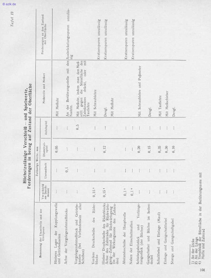 Höchstzulässige Verschleiß— und Spielwerte, Forderungen in bezug auf Zustand der Oberfläche Tafel 13 Forderungen den Zustand der Benennung der der Gleltpo•re Hinteres La er der Kupplungswelle und Getriebe asten Achse der Vorgelegezahnradblocks Vorgelegezahnradblock und Getriebe- kasten (bei Vorhandensein aller Scheiben) Vordere Druckscheibe des Räder. blocks Hintere • Druckscheibe des Räderblocks Achse des Zahnrades für Rückwärts- gang—Zahnrad für Rückwärtsgang in Ger Wirkungszone des Zahnra. es) Abstandsscheibe der Hauptwelle Naben der Einschaltrnuiien Schiebegabelsiück und Verlänge- rungsstück (der Büchse) Gangschalter und Büchse im Seiten- deckel Schalthebel und Einlage (Maul) Einlage und Gangschalthebel Stange und Gangschaltgabel Ver Durch- 0,15' 0,151 Werte. mm Diametral- Unrundheit 0,05 0.12 0.20 o. 15 0.35 0.30 o. 10 Meßstelle und Mit Meßuhr 0.5 An der Berührungssielle mit den Ausbröckelungsspurcn Nadeln. Mit Meßuhr, indem man den Meß- Stift gegen die Stirniläche des Zahnkranzes drückt. Oder mit unzuläs- Tastlehre Mit Schraublehre Desgl. Mit Meßuhr Mit Schraublehre und Paßmcter Desgl. Mit Tastlehre Mit Meßschieber Desgl. Kratzerspuren unzulässig Kraizerspuren unzulässig Kratzerspurcn unzulässig Kratzersptjren unzulässig 2 4) An der Dicke An der Länge Verschleiß der Stirnfläche in der Berührungszone mit Mujic und Zahnrad