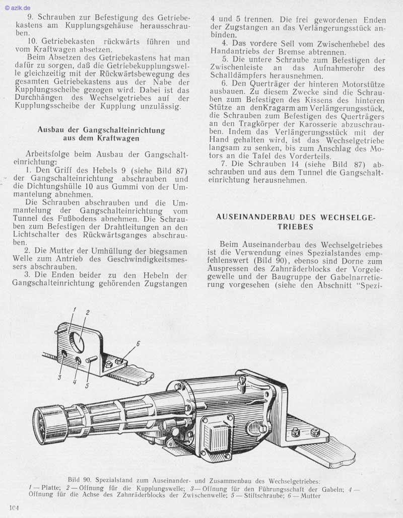 @ azkde 9. Schrauben zur Befestigung des Getriebe- kastens am Kupplungsgehäuse herausschrau- ben. 10. Getriebekasten rückwärts führen und vom Kraftwagen absetzen. Beim Absetzen des Getriebekastens hat man dafür zu sorgen. daß die Getriebekupplungswel• le gleichzeitig mit der Rückwärtsbewegung des gesamten Getriebekastens aus der Nabe der Kupplungsscheibe gezogen wird. Dabei ist das Durchhängen des Wechselgetriebes auf der Kupplungsscheibe der Kupplung unzulässig. Ausbau der Gangschalteinrichtung aus dem Kraftwagen Arbeitsfolge beim Ausbau der Gangschalt• einrichtung: l. Den Griff des Hebels 9 (siehe Bild 87) der Gangschalteinrichtung abschrauben und dic Dichtungshülle 10 aus Gummi von der t_Jrn• mantelung abnehmen. Die Schrauben abschrauben und die Um- mantelung der Gangschalteinrichtung vorn Tunnel des Fußbodens abnehmen. Die Schrau• ben zum Befestigen der Drahtleitungen an den Lichtschalter des Rückwärtsganges abschrau- ben. 2. Die Mutter der Umhüllung der biegsamen Welle zum Antrieb des Geschwindigkeitsmes- sers abschrauben. 3. Die Enden beider zu den Hebeln der Gangschalteinrichtung gehörenden Zugstangen 2 5 4 und 5 trennen. Die irei gewordenen Enden der Zugstangen an das Verlängerungsstück an- binden. 4. Das vordere Seil vom Zwischenhebel des Handantriebs der Bremse abtrennen. 5. Die untere Schraube zum Befesti en der Zwischenleiste an das Aufnahmero r des Schalldämpfers herausnehmen. 6. Den Querträger der hinteren Motorsiütze ausbauen. Zu diesem Zwecke sind die Schrau• ben zum Befestigen des Kissens des hinteren Stütze an denKragarm am Verlängerungsstück, die Schrauben zum Befestigen des Querträgers an den Tragkörper der Karosserie abzuschrau- ben. Indem das Verlängerungsstück mit der Hand gehalten wird. ist das Wechselgetriebe langsam zu senken, bis zum Anschlag des Mo- tors an die Tafel des Vorderteils. 7. Die Schrauben 14 (siehe Bild 87) ab- schrauben und aus dem Tunnel die Gangschalt- einrichtung herausnehmen. AUSEINANDERBAU DES WECHSELGE- TRIEBES Beim Auseinanderbau des Wechselgetriebes ist die Verwendung eines Spezialstandcs emp- fehlenswert (Bild 90), ebenso sind Dorne zum Auspressen des Zahnräderblocks der Vorgele- gewelle und der Baugruppe der Gabelnarretie. rung vorgesehen (siehe den Abschnitt "Spezi- Bild 90. Spezialstand zum Auseinander• und Zusammenbau des Wechselgetriebes: / — Platte; 2 —Öffnung für die Kupplungsn•elle; 3— Of/nung den Führungsschaft der Gabeln; — Offnung für die Achse des Zahnräderblocks der Zwischenwelle; 5— Stiitschranbe: 6 — Mutter