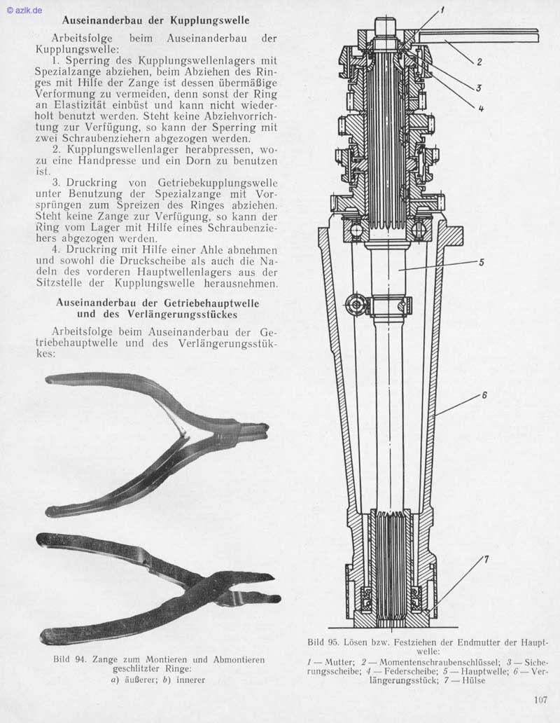 @ azlk_de Auseinanderbau der Kupplungswelle Arbeitsfolge beim Auseinanderbau der Kupplungswelle: l. Sperring des Kupplungswellenlagers mit Spezialzange abziehen. beim Abziehen des Rin- ges mit I lilie der Zange ist dessen übermäßige Verformung zu vertneiden. denn sonst der Ring an Elastizität einbiist und kann nicht wieder- holt benutzt werden. Steht keine Abziehvorrich- tung zur Veriügung, so kann der Sperring mit zwei Schraubenziehern abgezogen werden. 2. Kupplungswellenlager herabpressen, wo- zu eine Handpresse und ein Dorn zu benutzen 3. Druckring von Getriebekupplungswelle unter Benutzung der Spezialzange mit Vor- spriingen zum Spreizen des Ringes abziehen. Steht keine Zange zur Verfügung, so kann der Ring Vom Lager mit Hilfe eines Schraubenzie- hers abgezogen werden. 4. Druckring mit Hilfe einer Ahle abnehmen und sowohl die Druckscheibe als aucll die Na- dein des vorderen Hauptwellenlagers aus der Sitzstelle der Kupplungswelle herausnehmen. Auseinanderbau der Getriebehauptwelle und des Verlängerungsstiickes Arbeitsfolge beim Auseinanderbau der Ge- triebehauptwelle und des Verlängerungsstük• kes: Bild 94. Zange zum Montieren und Abmontieren geschlitzter Ringe: a) äußerer; b) innerer 14 2 3 5 6 7 Bild 95. Lösen bzw. Festziehen der Endmutter der Haupt- Welle: I — Mutter; 2— Momentenschraubenschlüssel•. — Siche• rungsscheibe; 4 — Federwheibe: 5— llanptwelle; 6— Ver- längerungsstück; 7 — [lülse