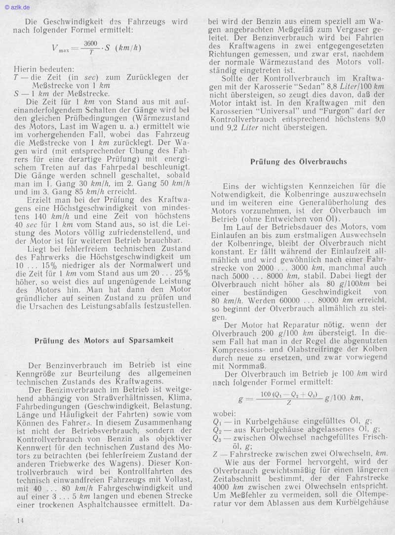 @ azik_de Die Geschwindigkeit d2s Fahrzeugs nach folgender Formel ermittelt: • S (km/h) Hierin bedeuten: wird T — die Zeit (in see•) zum Zurücklegen der Meßstrecke von I km S— I km der Meßstrecke. Die Zeit für I km von Stand aus mit auf- einanderfolgendem Schalten der Gänge wird bei den gleichen Priifbedingungen (Wärmezustand des Motors, Last im Wagen u. a.) ermittelt wie im vorhergehenden Fall, wobei das Fahrzeug die Meßstrecke von I km zurücklegt. Der Wa• gen wird (mit entsprechender Übung des Fah- rers für eine derartige Prüfung) mit energi• schem Treten auf das Fahrpedal beschleunigt, Die Gänge werden schnell geschaltet. sobald man im l. Gang 30 km/h, im 2. Gang 50 km/h und int a. Gang 85 km/h erreicht. Erzielt man bei der Prüfung des Kraitwa• gens eine l•löchstgesehwindigkeit von mindes• tens 140 km/h und eine Zeit von höchstens 40 sec für I km vom Stand aus, so ist die Lei- stung des Motors völlig zufriedenstellend, und der Motor ist für weiteren Betrieb brauchbar. Liegt bei fehlerfreiem technischen Zustand des Fahrwerks die Höchstgeschwindigkeit um 15% niedriger als der Normalwert und 10 . 25% die Zeit für I km vorn Stand aus um 20 . höher. so weist dies auf ungenügende Leistung des Motors hin. Man hat dann den Motor gründlicher auf seinen Zustand zu prüfen und die Ursachen des Leistungsabfalls festzustellen. Prüfung des Motors auf Sparsamkeit Der Benzinverbrauch im Betrieb ist eine Kenngröße zur Beurteilung des allgemeinen technischen Zustands des Kraftwagens. Der Ben:zinverbrauch im Betrieb ist weitge- hend abhängig von Straßverhältnissen, Klima. Fahrbedingungen (Geschwindigkeit, Belastung, Länge und Häufigkeit der Fahrten) sowie vom In diesem Zusamtnenhang Können des Fahrers. ist nicht der Betriebsverbrauch, sondern der Kontrollverbrauch von Benzin als objektiver Kennwert für den technischen Zustand des Mo- tors zu betrachten (bei fehlerfreiem Zustand der anderen Triebwerke des Wagens). Dieser Kon- trollverbrauch wird bei Kontrollfahrten des technisch einwandfreien Fahrzeugs mit Vollast, 80 km/h Fahrgeschwindigkeit und mit 40 . 5 km langen und ebenen Strecke auf einer 3. einer trockenen Asphaltchaussee ermittelt. Da- bei wird der Benzin aus einem speziell arn Wa- gen angebrachten Meßgefäß zum Vergaser ge- leitet. Der Benzinverbrauch wird bei Fahrten des Kraftwagens in zwei entgegengesetzten Richtungen gemessen, und zwar erst. nachdem der normale Wärmezustand des Motors voll. ständig eingetreten ist. Sollte der Kontrollverbrauch im Kraftwa- gen mit der Karosserie • 'Sedan" 8,8 Liter/ 100 km nicht übersteigen, so zeugt dies davon, daß der Motor intakt ist. In den Kraftwagen mit den Karosserien "Universal" und "Furgon" dari der Kontrollverbrauch entsprechend höchstens 9,0 und Liter nicht übersteigen. Prüfung des Ölverbrauchs Eins der wichtigsten Kennzeichen für die Notwendigkeit, die Kolbenringe auszu wechseln und im weiteren eine Generalüberholung des Motors vorzunehmen. ist der Ölverbauch im Betrieb (ohne Entweichen von Öl). Im Lauf der Betriebsdauer des Motors, vom Einlauien an bis zum erstmaligen Auswechseln der Kolbenringe, bleibt der Ölverbrauch nicht konstant. Er fällt während der Einlaufzeit all- miilllich und wird gewöhnlich nach einer Fahr- strecke von 2000 . 3000 km, manchmal auch . 8000 stabil. Dabei liegt der nach 5000 Ölverbrauch nicht höher als 80 g/ 100kn1 bei beständigen Geschwindigkeit von einer 80 km/h. Werden 60000 . 80000 km erreicht. so beginnt der Ölverbrauch allmählich zu stei- gen. Der Motor hat Reparatur nötig, wenn der Ölverbrauch 200 km übersteigt. In die- sem Fall hat Inan in der Regel die abgenutzten Kompressions- und Olabstreiiringe der Kolben durch neue zu ersetzen, und zwar vorwiegend mit Normmaß. Der Ölverbrauch im Betrieb je 100 km wird nach folgender Forinel ermittelt: g— wobei: Ql — in Kurbelgehäuse eingefülltes Öl, g; — aus Kurbelgehäuse abgelassenes 01, g; Q3 — zwischen Ölwechsel nachgefülltes Frisch- Z —Fahrstrecke zwischen zwei Ölwechseln, kur. Wie aus der Formel hervorgeht, wird der Ölverbrauch gewichtsmäßig für einen längeren der der Fahrstrecke Zeitabschnitt bestilnnlt, 4000 km zwischen zwei Ölwechseln entspricht. Um Meßfehler zu vermeiden, soll die Öltempe- ratur vor dem Ablassen aus dem Kurbelgehäuse