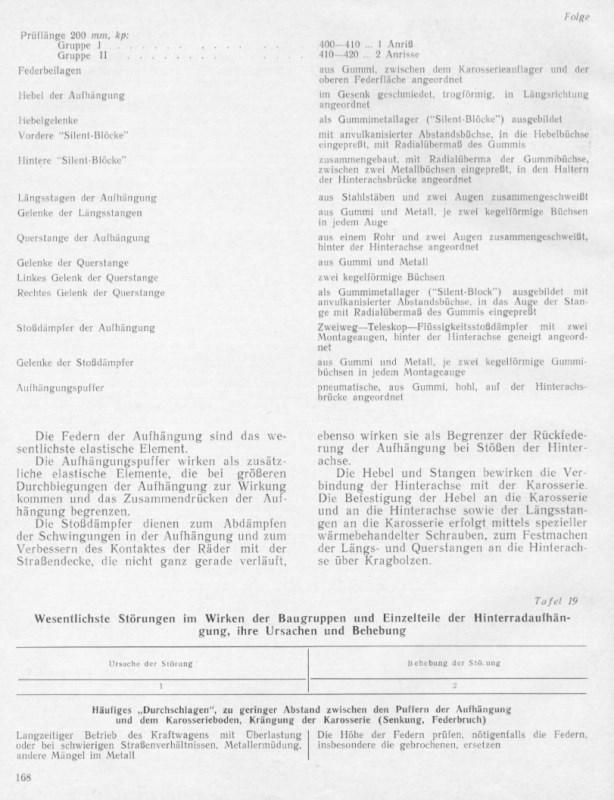 Prüflinge 200 ei Augen der "Gingung und der , hmiedel, in bä h,c. in die tallbüch•en eingrpredt. in Augen und d Metall. Rohr hinter H t Radi d je kegeliörmige Gelenk der Aufhängung der Die Federn der Aufhängung sind das We• sentlichste elastische Element. Die Wirken als zusätz, die größeren liche elastische Elemente. Durchbiegungen Auihangung zur Wirkun das Zusanunendrücken der hängung hegronzen. Dic Stoßdhrnpfer dienen Abdämpfen der Schwingungen ill der Anih;ingnng lind Verhessern des Kontaktes der Räder mit der nicht ganz gerade verläuft. Straßendecke, die der Hinternl•su ebenso wirken sie als Begrenzer der Rückiede• rung der Aufhängung bei Stößen der Ilinter- achse. Die Hebel und Stangen bewirken dic Ver. bindung der Hinterachse tnit der Karosserie Die Beiestigung der Hebel an die Karosserie und an die Hinterachse sowie der Längsstan• gen an die Karosserie erfolgt mittels spelieller wärmebehandelter Schrauben. zum Festmachen der Längs und Querstangen an dic Hinterach- se über Kragbolzen_ Wesentlichste Störungen im Wirken der Baugruppen und Einzelteile der Hinterradaulhän- ihre Ursachen und dem der 011er Im i i und Behebung der r nötigenfalls die dic