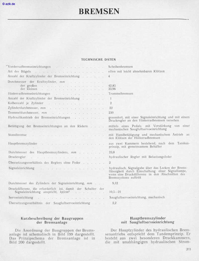 @ azlkde ¯V orderradbremseinrichtungen Ari des Bügels BREMSEN TECHNISCHE DATEN Anzahl der Kraiizylinder der Bremseinrichtung Durchmesser der Kraittylinder, roden Hinterradhremseinrichtungen Anzahl der Kraitzylindc•r der Bremseinrichtung Kolbenzahl je Zylinder Zylinderdurchmesser, mm Tronuneldurchrnesser. men Ilydraulikantrieb der Bremseinrichtungen Betätigung der Bremseinrichtungen an den Standhremse I lanptbremszylinder Rädern Durchmesser des Hauptbremszylinders, Druckrogler Obersetzungsverhiltnis des Reglers ohne Feder Signaleinrichtung Durchmesser des Zylinders der Druckdi[ierenl. die erforderlich Signaleinrichiung anspricht. Servoeinrichtung Signaleinrichinng. ist. darnii der Schalter & p /cm2 Übersetzungsverhhltnis der Saugluitservoeinrichtung Kurzbeschreibung der Baugruppen der Bremsanlage Die Anordnung der Baugruppen der Brems• anlage ist schematisch in Bild 199 dargestellt. Das Prinzipschema der Bremsanlage ist in Bild 200 dargestellt. Scheibenbremsen oiien mit leicht abnehmbaren Klötzen 4 42,85 Trommelbremsen gesondert, mit einer Signaleinrichtung und mit einet" Druckregler an den Hinterradbremsen versehen mittels eines Pedals mit Verstirkllng von einer mechanischen Saugltlftservoeinrichtnng mit Handbetätigung und mechanischem Antrieb an den Klötzen der Hinterradbremsen zwei Kammern bestehend. dem Tandem- prinzip, mit gemeinsamem Behälter 2.3.8 hydraulischer Regler mit Belastungsfeder 2 hydraulisch. Signalgabe über das Lecken der Brems• einer Signallampe. flussigkeit durch Einschaltun wenn eine Druckdifierenz in Abschnitten des Bremssystems auftritt 9,12 der Saugl mechanisch 2,2 Hauptbremszylinder mit Saugluftservoeinrichtung Der Hauptzylinder des hydraulischen Brem• senantriebs entspricht dem Tandemprinzip. Er besteht aus zwei besonderen Druckkammern. die mit unabhängigen hydraulischen Strom-