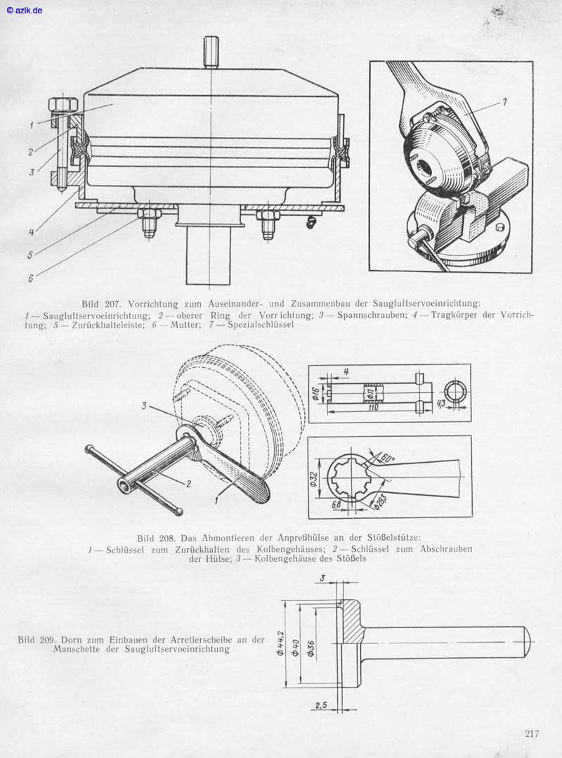 azlk_de Bild 207. Vorrichtung zum Auseinander. nnd Zusannnenbau der Saugluiiservoeinriclltung: l— Saugluitservoeinrichtung; 2 — oberer Ring der Vorr ichiung; 3 — Spannschrauben; 4 — Tragkörper der Vorrich- tung: 5 — Zurückhalteleiste•, 6 Mutter; 7 — Spezialschltissel Bild 208, Das Abmontieren der Anpreßhülse an der Stößclstütze: der Hülse: 3— Kolbengehäuse des Stößels Bild 209. Dorn Einbauen der Arretiersclleibe an der Manschette der Sauglnftservoeinrichtung 217