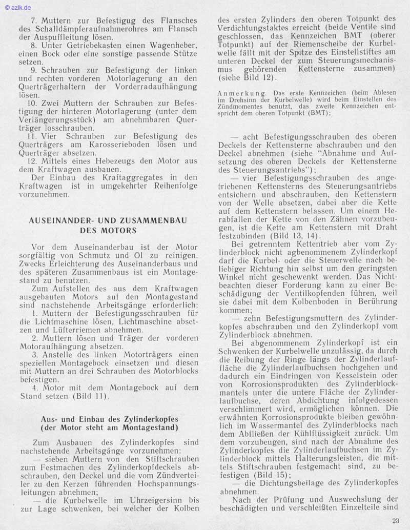 @ azlk_de 7. Muttern zur Befestigug des Flansches des Schalldämpieraufnahmerohres am Flansch der Auspuifleitung lösen. 8. Unter Getriebekasten einen Wagenheber, einen Bock oder eine sonstige passende Stütze setzen. 9. Schrauben zur Befestigung der linken und rechten vorderen Motorlagerung an den Querträgerhaltern der Vorderradaufhängung lösen. 10. Zwei Muttern der Schrauben zur Befes- tigung der hinteren Motorlagerung (unter dem Verlängerungsstück) am abnehmbaren Quer- träger losschrauben. I l. Vier Schrauben zur Befestigung des Querträgers am Karosserieboden lösen und Querträger absetzen. 12. Mittels eines Hebezeugs den Motor aus dem Kraftwagen ausbauen. Der Einbau des Kraitaggregates in den Kraftwagen ist in umgekehrter Reihenfolge vorzunehmen. AUSEINANDER- UND ZUSAMMENBAU DES MOTORS Vor dem Auseinanderbau ist der Motor sorgfältig von Schmutz und Öl zu reinigen. Zwecks Erleichterung des Auseinanderbaus und des späteren Zusammenbaus ist ein Montage- stand zu benutzen. Zum Aufstellen des aus dem Kraftwagen ausgebauten Motors auf den Monta gestand sind nachstehende Arbeitsgänge erforderlich: l. Muttern der Befestigungsschrauben für die Lichtmaschine lösen, Lichtmaschine abset- zen und Lüfterriemcn abnehmen. 2. Muttern lösen und Träger der vorderen Motoraufhängung absetzen. 3. Anstelle des linken Motorträgers einen speziellen Montagebock einsetzen und diesen mit Muttern an drei Schrauben des Motorblocks befestigen. 4. Motor mit dem Montagebock aui dem Stand setzen (Bild 11). Aus- und Einbau des Zylinderkopfes (der Motor steht am Montagestand) Zum Ausbauen des Zylinderkopfes sind nachstehende Arbeitsgänge vorzunehmen: sieben Muttern von den Stiftschrauben zum Festmachen des Zylinderkopfdeckels ab- schrauben, den Deckel und die vom Zündvertei- 1er zu den Kerzen führenden Hochspannungs- leitungen abnehmen; — die Kurbelwelle im Uhrzeigersinn bis zur Lage schwenken, bei welcher der Kolben des ersten Zylinders den oberen Totpunkt des Verdichtungstaktes erreicht (beide Ventile sind geschlossen. das Kennzeichen BMT (oberer Totpunkt) auf der Riemenscheibe der Kurbel- welle fällt mit der Spitze des Einstellstiftes am unteren Deckel der zum Steuerungsmechanis• mus gehörenden Kettensterne zusammen) (siehe Bild 12). Das erste Kennzeichen (beim Ablesen Anmerkun im Drehsinn er Kurbelwelle) Wird beim Einstellen des Zündmomentes benutzt. das zweite Kennzeichen ent- spricht dem oberen Totpunkt (BMT); — acht Befestigungsschrauben des oberen Deckels der Kettensterne abschrauben und den Deckel abnehmen (siehe "Abnahme und Auf- setzung des oberen Deckels der Kettensterne des Steuerungsantriebs") ; — vier Befestigungsschrauben des ange- triebenen Kettensterns des Steuerungsantriebs entsichern und abschrauben, den Kettenstern von der Welle absetzen, dabei aber die Kette auf dem Kettenstern belassen. Um einem He- rabiallen der Kette von den Zähnen vorzubetl• gen. ist die Kette am Kettenstern mit Draht festzubinden (Bild 13, 14) Bei getrenntem Kettentrieb aber vom Zy• linderblock nicht agbenomrnenem Zylinderkopf darf die Kurbel- oder die Steuerwelle nach bc- liebiger Richtung hin selbst um den geringsten Winkel nicht gesehewenkt werden. Das Nicht- beachten dieser Forderung kann zu einer Be• schädigung der Ventilkopienden führen. weil sie dabei mit dem Kolbenboden in Berührung kommen; zehn Befestigungsmuttern des Zylinder. kopfes abschrauben und den Zylinderkopf vom Zvlinderblock abnehmen. Bei abgenommenem Zylinderkopf ist ein Schwenken der Kurbelwelle unzulässig, da durch die Reibung der Ringe längs der Zylinderlauf- iläche die Zylinderlauibuchsen hochgehen und dadurch ein Eindringen von Kesselstein oder von Korrosionsprodukten des Zylinderblock- mantels unter die untere Fläche der Zylinder- laufbuchse. deren Abdichtung infolgedessen verschlimmert wird, ermöglichen können. Die erwähnten Korrosionsprodukte bleiben gewöhn- lich im Wassermantel des Zylinderblocks nach dem Abiließen der Kühlflüssigkeit zurück. Um dem vorzubeugen. sind nach der Abnahme des Zylinderkopfes die Zylinderlauibuchsen im Zy- linderblock mittels Halterungsleisten. die mit- tels Stiftschrauben iestgemacht sind, zu be- festigen (Bild 15); die Dichtungsbeilage des Zylinderkopfes abnehmen. Nach der Prüfung und Auswechslung der beschädigten und verschleißten Einzelteile sind 23