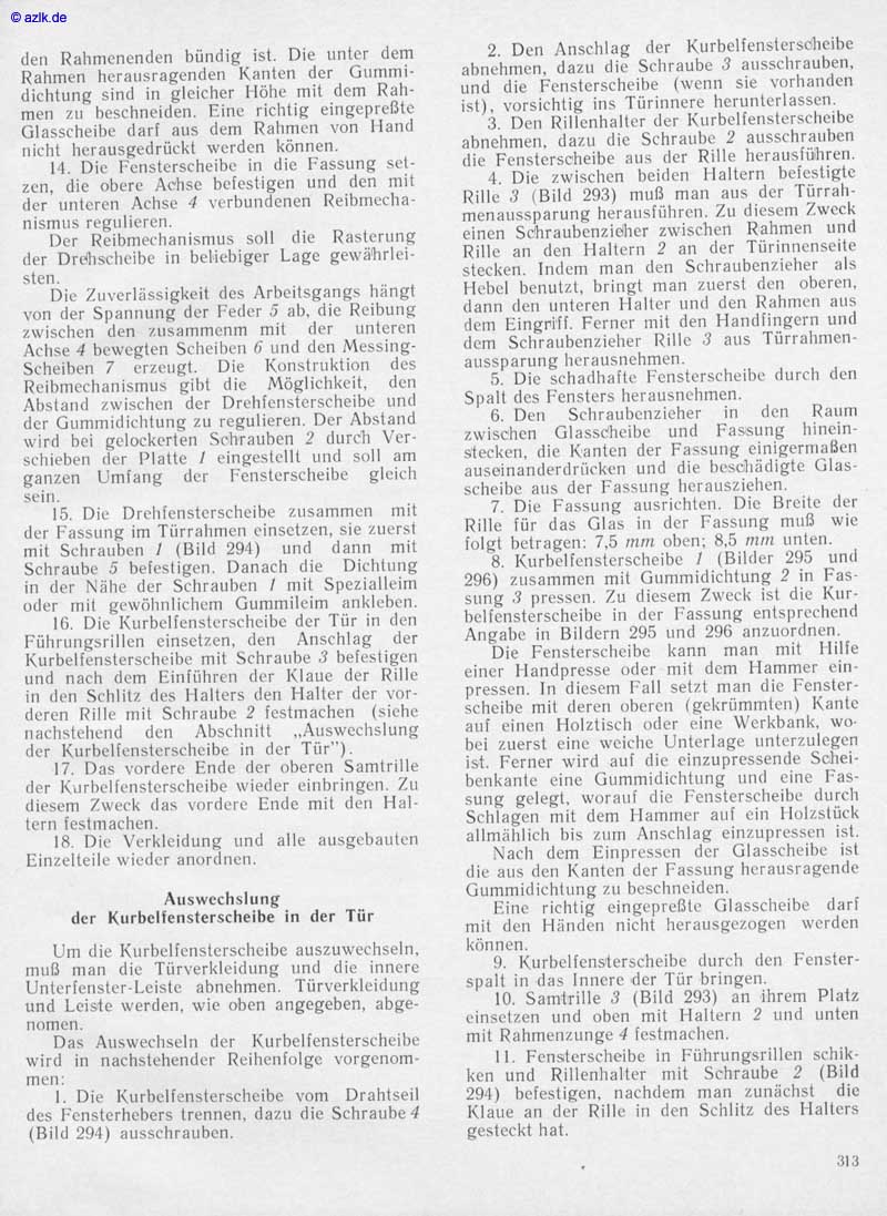 azlkde den Rahmenenden bündig ist. Die unter dem Rahmen herausragenden Kanten der Gummi- dichtung sind in gleicher Höhe mit dem Rah- men beschneiden. Eine richtig eingepreßte Glasscheibe darf aus dem Rahmen von Hand nicht herausgedrückt werden können. 1'1. Die Fensterscheibe in die Fassung set- Zen, die obere Achse befestigen und den mit der unteren Achse 4 verbundenen Reibmecha- nismus regulieren. Der Reibmeehanismus soll die Rasterung der Drehscheibe in beliebiger Lage gewährlei• Sten. Die Zuverlässigkeii des Arbeitsgangs hängt von der Spannung der Feder 5 ab, die Reibung zwischen den zusammenm mit der unteren Achse 4 bewegten Scheiben 6 und den Messing- Scheiben 7 erzeugt. Die Konstrukt ion des den Reibmechanismus gibt die Möglichkeit, Abstand zwischen der Drehfensterscheibe und der Gummidichtung zu regulieren. Der Abstand wird bei gelockerten Schrauben 2 durch Ver• schieben der Platte I eingestellt und soll am ganzen Umfang der Fensterscheibe gleich sein. 15. Die Dreh fensterscheibe zusammen mit der Fassung im Türrahmen einsetzen. sie zuerst mit Schrauben (Bild 294) und dann mit Schraube 5 beiestigen, Danach die Dichtung in der Nähe der Schrauben I mit Spezialleim oder mit gewöhnlichem Gummileim ankleben. 16. Die Kurbelfensterscheibe der Tür in den Führungsrillen einsetzen, den Anschlag der Kurbeliensterscheibe mit Schraube 3 befestigen und nach dem Einit"lhren der Klaue der Rille in den Schlitz des Halters den Halter der vor- deren Rille mit Schraube 2 festmachen (siehe nachstehend den Abschnitt „Auswechslung der Kurbelfensterscheibe in der Tür"). 17. Das vordere Ende der oberen Samtrille der Kurbelfensterscheibe wieder einbringen. Zu diesem Zweck das vordere Ende mit den Hal• tern festmachen. 18. Die Verkleidung und alle ausgebauten Einzelteile wieder anordnen. Auswechslung der Kurbeliensterscheibe in der Tür Um die Kurbelfensicrscheibe auszuwechseln, muß man die Tiirverkleidung und die innere Unterfenster•Leisie abnehmen. Tiirverkleidnng und Leiste werden, wie oben angegeben, abge- nornen. Das Auswechseln der Kurbeliensterscheibe wird in nachstehender Reihenfolge vorgenom- men : l. Die Kurbeliensterscheibe vom Drahtseil des Fensterhebers trennen, dazu die Schraube 4 (Bild 294) ausschrauben. 2. Den Anschlag der Kurbelfensterseheibe abnehmen, dazu die Scllraube 3 ausschrauben, und die Fensterscheibe (wenn sie vorhanden ist). vorsichtig ins Türinnere herunterlassen. 3. Den Rillenhalter der Kurbelfensterscheibe abnehmen. dazu die Schraube 2 ausschrauben die Fensterscheibe aus der Rille herausführen. 4. Die zwischen beiden Haltern befestigte Rille 3 (Bild 293) muß man aus der Türrah- menaussparung herausführen. Zu diesem Zweck einen Schraubenzieher zwischen Rahmen und Rille an den Haltern 2 an der Tiirinnenseite stecken. Indem man den Schraubenzieher als Hebel benutzt, bringt man zuerst den oberen. dann den unteren Halter und den Rahmen aus dem Eingriff. Ferner mit den Handfingern und dem Schraubenzieher Rille 3 aus Türrahmen- aussparung herausnehmen. 5. Die schadhaite Fensterscheibe durch den Spalt des Fensters herausnehmen. 6. Den Schraubenzieher in den Raum zwischen Glasscheibe und Fassung hinein- stecken, die Kanten der Fassung einigermaßen auseinanderdriicken und die beschädigte Glas- scheibe aus der Fassung herausziehen, 7. Die Fassung ausrichten. Die Breite der Rille für das Glas in der Fassung muß wie folgt betragen: 7,5 mm oben; mm unten. 8. Kurbel fensterscheibe (Bilder 295 und 296) zusammen mit Gummidichtung 2 in Fas- sung 3 pressen. Zu diesem Zweck ist die Kur- belfensterscheibe in der Fassung entsprechend Angabe in Bildern 295 und 296 anzuordnen. Die Fensterscheibe kann man mit Hilfe einer Handpresse oder mit dem Hammer ein- pressen. In diesem Fall setzt man die Fenster- scheibe mit deren oberen (gekrümmten) Kante auf einen Holztisch oder eine Werkbank, wo, bei zuerst eine weiche Unterlage unterzulegen ist. Ferner wird auf die einzupressende Schei- betlkante eine Gummidichtung und eine Fas- sung gelegt. woraui die Fensterscheibe durch Schlagen mit dem Hammer auf ein llolzsiück allmählich bis Anschlag einzupressen ist. Nach dem Einpressen der Glasscheibe ist die aus den Kanten der Fassung herausragende Gummidichtung zu beschneiden. Eine richtig eingepreßte Glasscheibe darf mit den Händen nicht herausgezogen werden können. 9. Kurbelfensterscheibe durch den Fenster- spalt in (las Innere der Tür bringen. 10. Samtrille 3 (Bild 293) an ihrem Platz einsetzen und oben mit Haltern 2 und unten mit Rahmenzunge 4 festmacllen. 11. Fensterscheibe in Führungsrillen schik- ken und Rillenhalter mit Schraube 2 (Bild '294) befestigen, nachdem man zunächst die Klaue an der Rille in den Scillitz des Halters gesteckt hat. 313