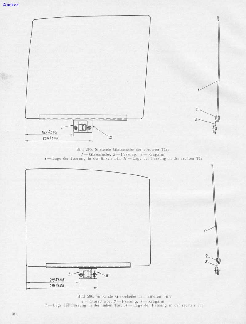 @ azlkde f920,'f5 Bild 295. Sinkende Glasscheibe der Tür: / — Glasscheibe: 2 — Fassung; — Kragarm I — Lage der Fassung in der linken Tür: 11 — Lage der Fnssung in der rechten Tür 2 219±145 Bild 296. Sinkende Glasscheibe der hinteren Tür: / — Glasscheibe: 2— Fassung; J— Kragarm I — Lage dee Fassung in der linken Tür; 11 — Lage der Fassung in der rechten Tür