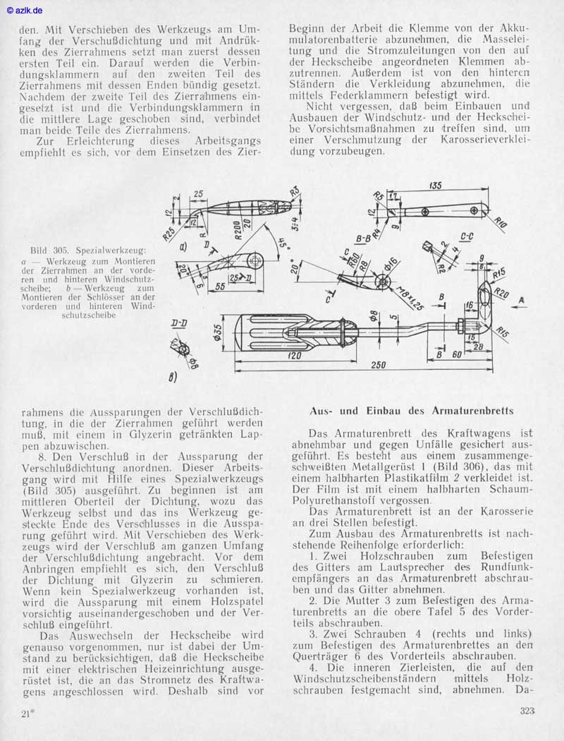 @ azikde den. Mit Verschieben des Werkzeugs am Um- iang der Verschußdichtung und mit Andriik- ken des Zierrahnlens setzt man zuerst dessen ersten Teil ein. Darauf werden die Verbin- [In ngsklanltnern auf den zweiten Teil des Zierrahmens mit dessen Enden bündig gesetzt, Nachdem der zweite 'Feil des Zierralunens ein- geseilt ist und die Verbindungsklatlltnern in die mittlere Lage geschoben sind, verbindet man beide Teile des Zierrahmens. Zur Erleichterung dieses Arbeitsgangs empiiehlt es sich, vor dem Einsetzen des Zier• 25 a) Bild Spezialwerkzeug: Werkzeug Montieren der Zierrahmen der vorde- nnd hinteren Windschutz- scheibe; b — Werkzeug Montieren der Schlösser an der vorderen hinteren Wind- sehnt tscheibe rahmens die Aussparungen der Verschlußdich- tung. in die der Zierrahmen geführt werden perl abzuwischen. 8. Den Verschluß in der Aussparung der Verschlußdichtung anordnen. Dieser Arbeits- gang wird mit Hilfe eines Spezialwerkzeugs (Bild 305) ausgeführt. Zu beginnen ist am mit tleren Oberteil der Dichtung. wozu das Werkzeug selbst und das ins Werkzeug ge- steckte Ende des Verschlusses in die Ausspa- rung geführi wird. Mit Verschieben des Werk- zeugs wird der Verschluß am ganzen Umfang der Verschlußdichtnng angebracht. Vor dem Anbringen empfiehlt es sich. den Verschluß der Dichtung mit Glyzerin zu schmieren. Wenn kein Spezialwerkzeug vorhanden ist, wird die Aussparung mit einem Holzspatel vorsichtig auseinandergeschoben und der Ver- schluß eingeiiihrt. Das Auswechseln der Heckscheibe wird genauso vorgenotntnen, nur ist dabei der Um- stand zu beriicksicht'igen, daß die Heckscheibe mit einer elektrischen Heizeinrichtung ausge- rüstet ist, die an das Stromnetz des Kraftwa- gens angeschlossen wird. Deshalb sind vor Beginn der Arbeit die Klemme von der Akku- mulaiorenbatterie abzunehmen. die Masselei- tung und die Stromzuleitungen von den auf der Heckscheibe angeordneten Klemmen ab- zutrennen. Außerdem ist von den hinteren Ständern die Verkleidung abzunehmen. die mittels Federklanunern befestigt wird. Nicht vergessen. daß beim Einbauen und Ausbauen der Windschutz- und der Heckschei- be Vorsichtsmaßnahmen zu treffen sind. um einer Verseht'] u' zung der Karosserieverklei- dung vorzubeugen. 60 Aus- und Einbau des Armaturenbretts Das Armaturenbrett des Kraftwagens ist abnehmbar und gegen Unfälle gesichert aus- geführt. Es besteht aus einem zusammenge- schweißten Metallgeriist I (Bild 306), das mit einem halbharten Plastikatiilm 2 verkleidet ist. Der Film ist mit einem halbharten Schaum- Polyurethanstoif vergossen. Das Armaturenbrett ist an der Karosserie an drei Stellen befestigt. Zum Ausbau des Armaturenbretts ist nach- stehende Reihenfolge erforderlich: l. Zwei Holzschrauben zum Befestigen des Gitters am Lautsprecher des Rundiunk- empfängers an das Armaturenbrett abschrau- ben und das Gitter abnehmen. 2. Die Mutter 3 zum Befestigen des Arma- turenbretts an die obere Tafel 5 des Vorder- teils abschrauben. 3. Zwei Schrauben 4 (rechts und links) zum Befestigen des Armaturenbrettes an den Querträger 6 des Vorderteils abschrauben. 4. Die inneren Zierleisten. die auf den Windschutzscheibenstindern mittels Holz• schrauben festgemacht sind. abnehmen. Da-