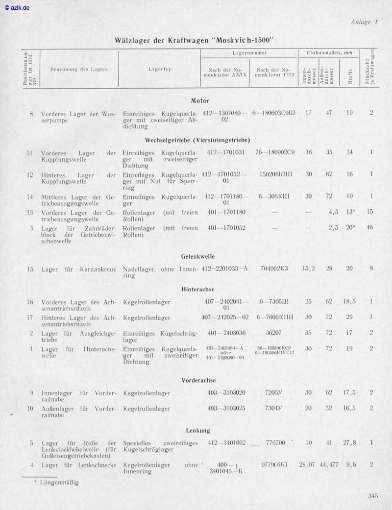 azlk_de Nach Anlag i' Wälzlager der Kraftwagen "Moskvich Motor -1500" S 11 12 13 16 17 9 Vorderes Lager der Was- serpumpe Vorderes L ager Kupplungswelle llinteres Lager Kupplungswelle Einreihiges Kugelquerla. 6 ger mit zweiseitiger Ab- dichtung Wechselgetriebe ( Vierstuiengelriebe) der der Einreihiges Kugelquerla• Zweiseitiger fichiung Einreihiges Kugelquerla- ger mit Nut inr Sperr- 412—1701031 412—1701032— 01 01 401—1701180 Mittleres Lager der Ge• triebeausgangswelle Vorderes Lager der Ge- triebeausgangswelle [ihr Zahnräder- block der Getriebezwi- schenwolle Lager Kardankreuz Vorderes Lager des Ach• «enantriebsrit*.els Elinteres Lager des Ach• senantriebsritzels ring Einreihiges Rollenlager Rollen) Rollenlager Rollen) Nadellager. ring Kugelquerla- (mit (mit ohne freien freien Kegelrollenlager Kegelrollenlnger Gelenkwelle Innen. 412-2201033-A Hinterachse 407—2402041— 01 407—242025AY2 Lager i riebe La für I nnenlager Außenlager radnabe A usgleiehge• Hinterachs• Einreihiges tager Einreihiges Bichtung Kugelschriig- Kugelquerla- zweiseitiger 401—2403036 iGr Vorder- Vordcr• Kegelrollenlager Kegelrollenlager Vorderachse 403—3103020 Lenkung 1-113 76— 180W2C9 7049021<3 (VG 305111 36207 720(iY 7300' 776700 9779UC,K1 17 16 30 30 15,2 25 30 30 30 10 28,07 47 62 72 28 62 72 72 72 62 52 41 u, 477 19 14 16 19 20 18.5 29 17 19 17.5 16,5 27,8 2 15 46 2 2 2 '2 Rolle der Lenkstockhebelw•elle G t'ßeisengetriebekasten) Lager för Lenkschneeke • l..ingennuiBig zweireihiges Spezielles Kugelschräglager Kegelrollenlager Innenring ohne • 400— 3401045—6