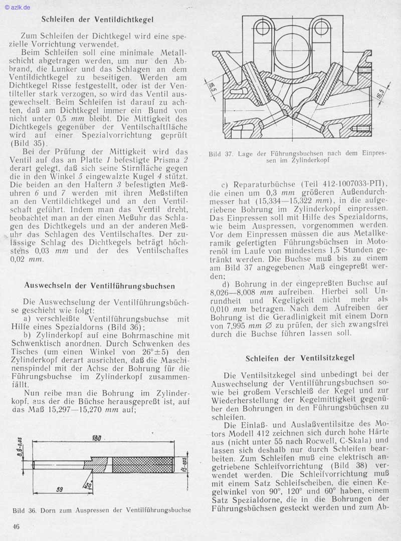 @ azkde Schleifen der Ventildichtkegel Zum Schleifen der Dichtkegel wird eine spe• zielle Vorrichtung verwendet. Beim Schleifen soll eine minimale Metall- schicht abgetragen werden, um nur den Ab- brand, die Lunker und das Schlagen an dem Ventildichtkegel zu beseit igen. Werden am Dichtkegel Risse festgestellt, oder ist der Ven- tilteller stark verzogen. so wird das Ventil aus- gewechselt. Beim Schleifen ist darauf zu ach- ten. daß am Dichtkegel immer ein Bund von nicht unter 0.5 mm bleibt. Die Mittigkeit des Dichtkegels gegenüber der Ventilschaftiläche wird auf einer Spezial vorrichtung geprüft (Bild 35). Bei der Prüfung der Mittigkeit wird das Ventil auf das an Platte I befestigte Prisma '2 derart gelegt, daß sich seine Stirnfläche gegen die in den Winkel 5 eingewalzte Kugel stiitzt. Die beiden an den Haltern 3 befestigten Meß- uhren 6 und 7 werden mit ihren Meßstiften an den Ventildichtkegel und an den Ventil- schait geführt. Indem man das Ventil dreht. beobachtet man an der einen Meßuhr das Schla- gen des Diehtkegels und an der anderen Meß- uhr das Schlagen des Ventilschaftes. Der zu- lässige Schlag des Dichtkegels beträgt höch• stehs 0,03 mm und der des Ventilschaftes 0,02 Auswechseln der Ventilführungsbuchsen Die Auswechselung der Ventiliührungsbüch- se geschieht wie folgt: a) verschleißte Ventiliührungsbuchse mit Hilfe eines Spezialdorns (Bild 36); b) Zylinderkopf aui eine Bohrmaschine mit Schwenktisch anordnen. Durch Schwenken des Tisches (um einen Winkel von 260±5) den Zylinderkopf derart ausrichten, daß die Maschi- nenspindel mit der Acllse der Bohrung für die Führungsbuchse im Zylinderkopf zusammen- fällt. Nun reibe mun die Bohrung im Zylinder. kopf. gus vier die Büchse herausgepreßt ist, auf das Maß 15,297—15,270 mm auf; 59 Bild 36. Dorn zum Auspressen der Ventiliührungsbuchse 46 Bild 37. Lage der Führtmgsbtwhsen nach dem Einpres• sen im Zylinderkopf Reparaturbiichse (Teil 412-1007033.PV1). messer hai (15.334—15,322 mm), in die auige- riebene Bohrung im Zylinderkopf einpressen. Das Einpressen soll mit Hilfe des Spezialdorns, wie beim Auspressen. vorgenommen werden, Vor dem Einpressen müssen die aus Metallke• ramik gefertigten Führungsbiichsen in Moto- renöl im Laufe von mindestens Stunden ge- tränkt werden. Die Buchse muß bis zu einem am Bild 37 angegebenen Maß eingepreßt wer- den; d) Bohrung in der eingepreßten Buchse aui 8,026—8.008 mm aufreiben. Ilierbei soll Un• rundheit und Kegeligkeii nicht mehr als 0,010 mm betragen. Nach dem Aufreiben der Bohrung ist die Geradlinigkeit mit einem Dorn von 7,995 mm Ø zu prüfen, der sich zwangsfrei durch die Buchse führen lassen soll. Schleifen der Ventilsitzkegel Die Ventilsitzkegel sind unbedingt bei der Auswechselung der Ventiliührungsbuchsen so- wie bei großem Verschleiß der Kegel und zur Wiederherstellung der Kegelmittigkeii gegenü- her den Bohrungen in den Führungsbüchsen zu schleifen. Die Einlaß- und Auslaßventilsitze des Mo- tors Modell 412 zeichnen sich durch hohe Iliirte aus (nicht unter 55 nach Rocwell, C-Skala) und lassen sich deshalb nur durch Schleifen bear- beiten. Zum Schleifen muß eine elektrisch an- getriebene Schleifvorrichtung (Bild 38) ver- wendet werden. Die Schleiivorrichtung muß mit einem Satz Schleifscheiben. die einen Ke- gelwinkel von 900. 1200 und 600 haben, einenl Satz Spezialdorne, die in die Bohrungen der Führungsbüchsen gesteckt werden und zum Ab-