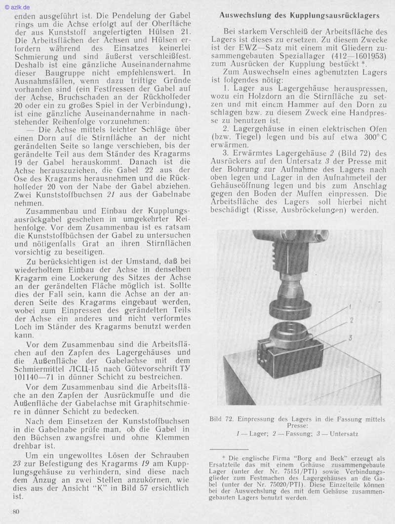 @ az/k_de enden ausgeführt ist. Die Pendelung der Gabel rings um die Achse erfolgt auf der Oberiläche der aus Kunststoff angeiertigten Hiilsen 21. Die Arbeitsflächen der Achsen und Hülsen er- fordern während des Einsatzes keinerlei Schmierung und sind äußerst verschleißfest. Deshalb ist eine gänzliche Auseinandernahme dieser Baugruppe nicht empfehlenswert. In Ausnahmsfällen, wenn dazu triftige Gründe vorhanden sind (ein Festfressen der Gabel auf der Achse, Bruchschaden an der Rückholfeder 20 oder ein zu großes Spiel in der Verbindung), ist eine gänzliche Auseinandernahme in nach- stehender Reihenfolge vorzunehmen: Die Achse mittels leichter Schläge über einen Dorn auf die Stirniläche an der nicht gerändelten Seite so lange verschieben, bis der gerändelte Teil aus dem Ständer des Kragarms 19 der Gabel herauskommt. Danach ist die Achse herauszuziehen. die Gabel 22 aus der Öse des Kragarms herausnehmen und die Rück- holieder 20 von der Nahe der Gabel abziehen. Zwei Kunststoffbuchsen 21 aus der Gabelnabe nehmen. Zusammenbau und Einbau der Kupplungs- ausriickgabel geschehen in umgekehrter Rei• henfolge. Vor dem Zusammenbau ist es ratsam die Kunststoffbüchsen der Gabel zu untersuchen und nötigenfalls Grat an ihren Stirnflächen vorsichtig zu beseitigen. Zu berücksichtigen ist der Umstand. daß bei wiederholtem Einbau der Achse in denselben Kragarm eine Lockerung des Sitzes der Achse an der gerändelten Fläche möglich ist. Sollte dies der Fall sein, kann die Achse an der an- deren Seite des Kragarms eingebaut werden, wobei zum Einpressen des gerändelten Teils der Achse ein anderes und nicht verformtes Loch im Ständer des Kragarms benutzt werden kann. Vor dem Zusammenbau sind die Arbeitsflä- chen auf den Zapfen des Lagergehäuses und die Außenfläche der Gabel achse mit Tlem Schmiermittel JICU-15 nach Gütevorschriit TV 101140—71 in dünner Schicht zu bestreichen. Vor dem Zusammenbau sind die Arbeitsilii• che an den Zapfen der Ausrückmuiie und die Außenfläche der Gabelachse mit Graphitschmie• re in dünner Schicht zu bedecken. Nach dem Einsetzen der Kunststoffbuchsen in die Gabelnabe prüfe man. ob die Gabel in den Büchsen zwangsfrei und ohne Klemmen drehbar ist. Um ein ungewolltes Lösen der Schrauben 23 zur Befestigung des Kragarms 19 am Kupp- lungsgehäuse zu verhindern, sind diese nach dem Anzug an zwei Stellen anzukörnen, wie dies aus der Ansicht "K" in Bild 57 ersichtlich 80 Auswechslung des Kupplungsausrücklagers Bei starkem Verschleiß der Arbeitsfläche des Lagers ist dieses zu ersetzen. Zu diesem Zwecke ist der EWZ—Satz Init einem mit Gliedern zu- sammengebauten Speziallager (412— 1601953) zum Ausrücken der Kupplung bestückt • . Zum Auswechseln eines agbenutzten Lagers ist folgendes nötig: l. Lager aus Lagergeh.öuse herauspressen, wozu ein Holzdorn an die Stirnfläche zu set• zen und mit einem Hammer auf den Dorn zu schlagen bzw. zu diesem Zweck eine Handpres- se zu benutzen ist. 2. Lagergehäuse in einen elektrischen Ofen (bzw. Tiegel) legen und bis auf etwa 300' C erwarmen. 3. Erwärmtes Lagergehäuse 2 (Bild 72) des Ausrückers auf den Untersatz 3 der Presse mit der Bohrung zur Aufnahme des Lagers nach oben legen und Lager in den Ailinalnneteil der Gehäuseöffnunu legen und bis zum Anschlag gegen den Boden der Muifen einpressen. Die Arbeitsfläche des Lagers soll hierbei nicht beschädigt (Risse, Ausbröckelunv•n) werden. Bild 72. Einpressung des Lagers in die Fassung mittels Presse: — Lager; 2 — Fassung; a — Untersaiz • Die englische Firma "Bor and Beck" erzeugt als Ersatzteile das mit einem zusammengebaute Lager (unier der Nr. 75151 /PTI) sowie Verbindungs- glieder Festmachen des Lager gehäuses an die Ga• bel (Illiter der Nr. 75020/PTl)v Diese Einzelteile können bei der Auswechslung des mit dem Geilfiuse zusammen. gebauten Lagers benutzt werden.