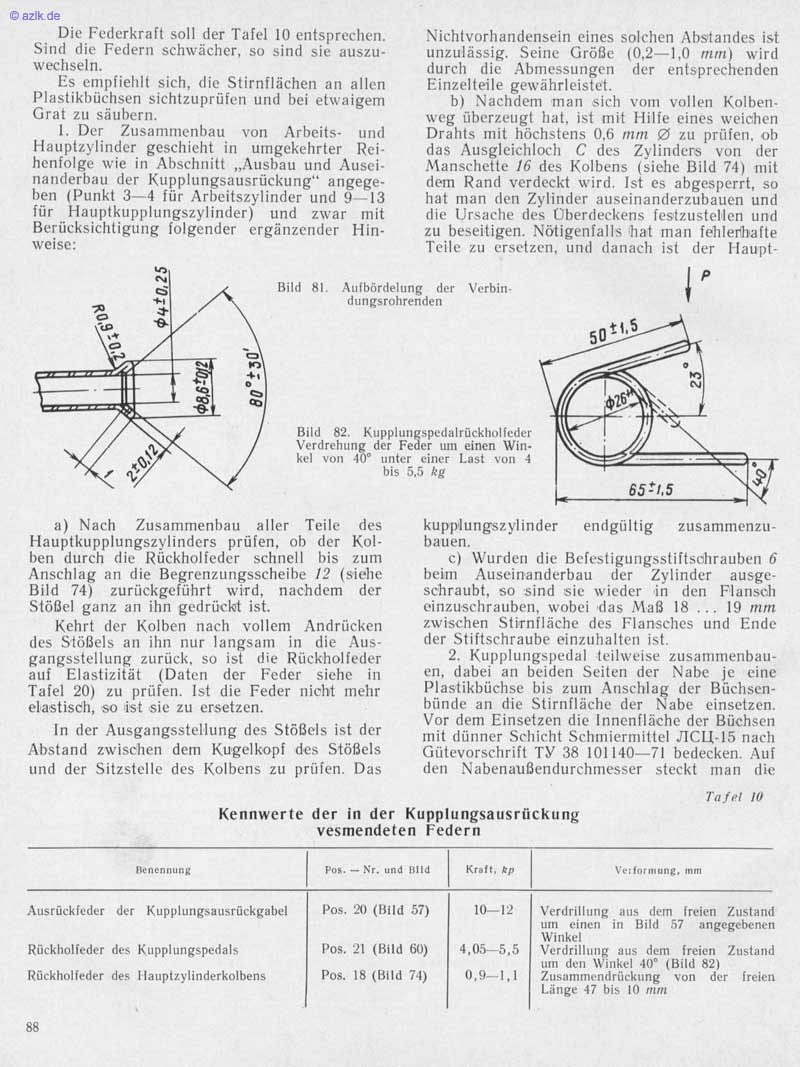 @ azkde Die Federkraft soll der Tafel 10 entsprechen. Sind die Federn schwächer, so sind sie auszu- wechseln. Es empfiehlt sich, die Stirnflächen an allen Plastikbüchsen sichtzuprüien und bei etwaigem Grat zu säubern. l. Der Zusammenbau von Arbeits- und Hauptzylinder geschieht in umgekehrter Rei- henfolge wie in Abschnitt „Ausbau und Ausci. nanderbau der Kupplungsausrückung" angege- ben (Punkt 3—4 für Arbeitszylinder und 9—13 für Hauptkupplungszylinder) und zwar mit Berücksichtigung folgender ergänzender Hin- weise: Nichivorhandensein eines solchen Abstandes ist unzulässig. Seine Größe (0,2—1,0 nun) wird durch die Abmessungen der entsprechenden Einzelteile gewährleistet. b) Nachdem man sich vom vollen Kolben. weg überzeugt hat, ist mit Hilfe eines weichen Drahts mit höchstens mm Ø zu prüfen. ob das Ausgleichloch C des Zylinders von der Manschette 16 des Kolbens (siehe Bild 74) mit dem Rand verdeckt wird. Ist es abgesperrt, so hat man den Zylinder auseinanderzubauen und die Ursache des Überdeckens festzustellen und zu beseitigen. Nötigenfalls 'hat man fehlerhafte Teile zu ersetzen. und danach ist der Haupt- Bild 81. Anibördelnng der Verbin- dungsrohrenden Verdrehun der FileåSePre(klrÜCkh01feder kel von unier einer Last von 4 bis 5.5 kg 50 a) Nach Zusammenbau aller Teile des Hauptkupplungszylinders prüfen, ob der Kol- ben durch die Rückholieder schnell bis zum Anschlag an die Begrenzungsscheibe 12 (siehe Bild 74) zurückgeführt wird, nachdem der Stößel ganz an ihn gedrückt ist. Kehrt der Kolben nach vollem Andrücken des Stößels an ihn nur langsam in die Aus- gangsstellung zurück. so ist die Rückholfeder auf Elastizität (Daten der Feder siehe in Tafel 20) zu prüfen. Ist die Feder nicht mehr elastisch, so ist sie zu ersetzen. In der Ausgangsstellung des Stößels ist der Abstand zwischen dem Kugelkopf des Stößels und der Sitzstelle des Kolbens zu prüfen. Das 650,5 kupplungszylinder endgültig zusammenzu- bauen. c) Wurden die Befestigungsstiftschrauben 6 beim Auseinanderbau der Zylinder ausge- schraubt, so sind sie wieder -in den Flansch einzuschrauben, wobei 'das Maß 18 . 19 mm zwischen Stirnfläche des Flansches und Ende der Stiftschraube einzuhalten ist. 2. Kupplungspedal teilweise zusammenbau- en, dabei an beiden Seiten der Nabe je eine Plastikbüchse bis zum Anschlag der Büchsen- bünde an die Stirnfläche der Nabe einsetzen. Vor dem Einsetzen die Innenfläche der Büchsen mit dünner Schicht Schmiermittel JICLI.15 nach Gütevorschrift TY 38 101140—71 bedecken. Auf den Nabenaußendurchmesser steckt man die 10 Kennwerte der in der Kupplungsausriickung vesmendeten Federn Ausrückieder Rückholieder Rückholfeder 88 Benennung der Kupplungsausrückgabel des Kupplungspedals des Hauptzylinderkolbens pos. und pos. 20 (Bild 57) Pos. 21 (Bild 60) Pos. 18 (Bild 74) 10—12 Verdrillung aus dem freien Zustand um einen in Bild 57 angegebenen Winkel Verdrillung aus dem ireien Zustand um den Winkel 400 (Bild 82) Zusammendrückung von der freien Länge 47 bis 10 turn